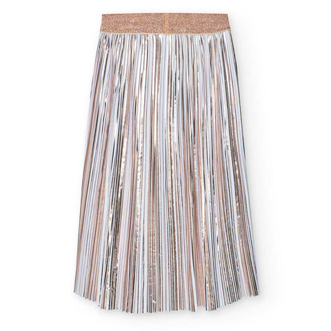 Gonna lunga della Linea Abbigliamento Bambina Boboli, con elastico in vita e plissettatura continua con bordi dorati su fondo bianco.