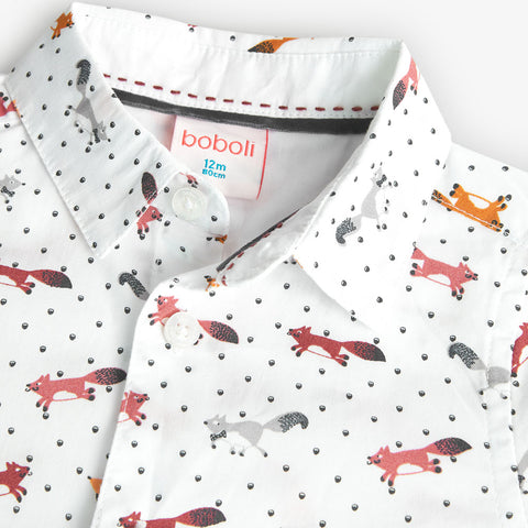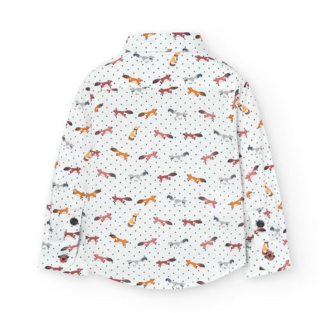 Langärmliges Hemd aus der Kinderbekleidungslinie Boboli mit einem Muster aus kleinen bunten Füchsen auf weißem Grund.