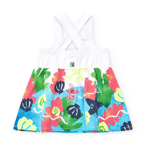 Kleidchen aus der Bekleidungslinie Tuc Tuc Bambina, Sommerkleid-Modell mit weitem Rock in fluoreszierenden Farben und Oberteil mit gekreuzten Trägern am Rücken.