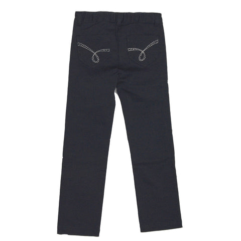Satinhose aus der Mirtillo Kinderkleidungslinie. Einfarbiges Muster fünf Taschen. Gesäßtaschen mit silberner Stickerei. Innen einstellbare Größe.