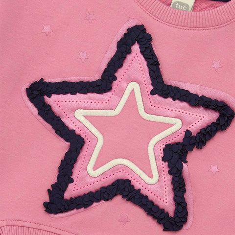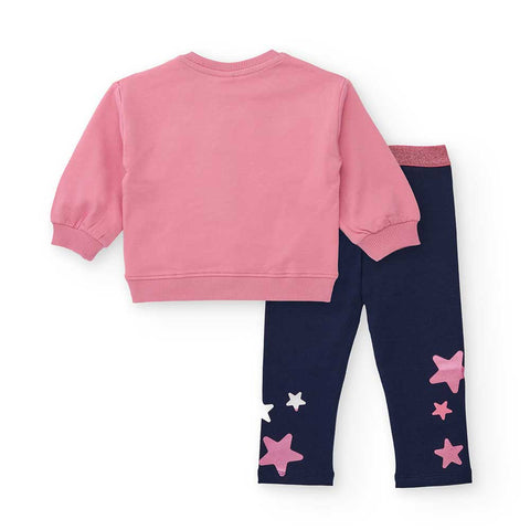 Zweiteiliges Set aus der Mädchenbekleidungslinie tuc tuc, mit kurzem Sweatshirt mit Stern in der Mitte und Leggings mit aufgedruckten Sternchen.