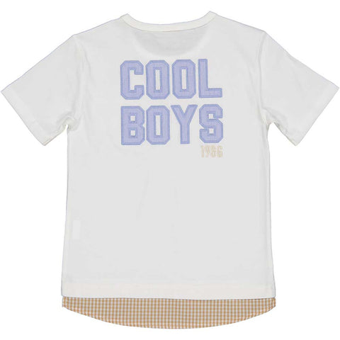 T-Shirt aus der Kinderbekleidungslinie Trybeyond, mit kleinen Taschen auf der Vorderseite und kariertem Stoff unten.